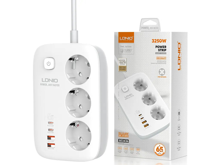 چندراهی برق LDNIO SE3436 GaN ترکیبی از پریزهای برق (AC) و پورتهای شارژ USB هست که برای استفاده در منزل، دفتر یا محلهایی که نیاز به چند دستگاه دارد مناسب است. این مدل با فناوری GaN (گالیوم نیترید) ساخته شده که به کاهش اندازه قطعات و بهبود کارایی کمک میکند.