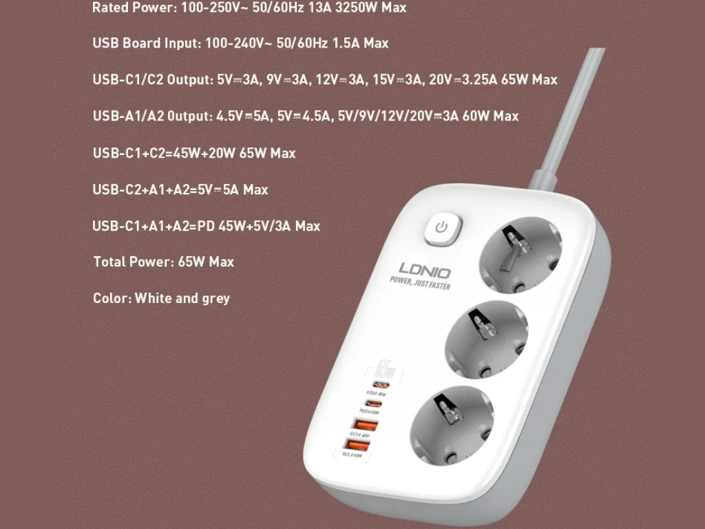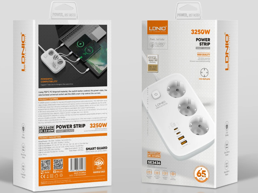 چندراهی برق LDNIO SE3436 GaN ترکیبی از پریزهای برق (AC) و پورتهای شارژ USB هست که برای استفاده در منزل، دفتر یا محلهایی که نیاز به چند دستگاه دارد مناسب است. این مدل با فناوری GaN (گالیوم نیترید) ساخته شده که به کاهش اندازه قطعات و بهبود کارایی کمک میکند.
